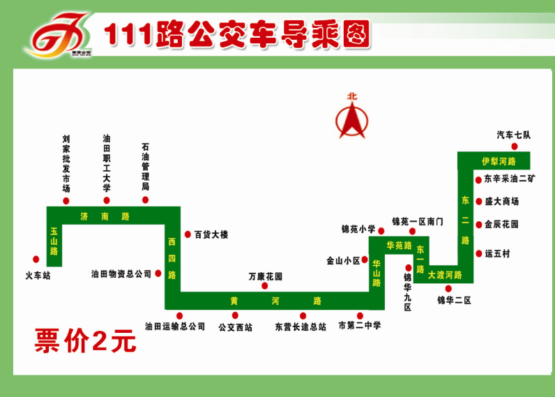 111路:該線路自汽車七隊始發,經伊犁河路(華瑞小區)、東二路(盛大商場、運五村)、大渡河路(錦華五區)、東一路(錦華九區),改經華苑路(錦苑一區南門、錦苑小學)、華山路(金山小區),到達黃河路后,恢復原線路,單程里程24.3公里,票價、班次均不變。
